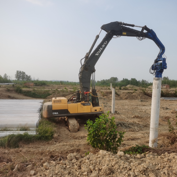 Hydraulischer Vibrierenstapelfahrer ziehen den Nutzen aus Hochfrequenzerschütterung erzeugt durch Motor und fahren die Erschütterungskraft zum hydraulischen Vibrierenstapelfahrer für den umgebenden Boden verflüssigend u. seine Struktur zu brechen, um die Reibung zu verringern durch; die Stapelform der Bodenboden über Bagger dann, anhäufend oder bohrend. Die Hochfrequenzerschütterung angetrieben durch den Hydraulikmotor des Baggers.