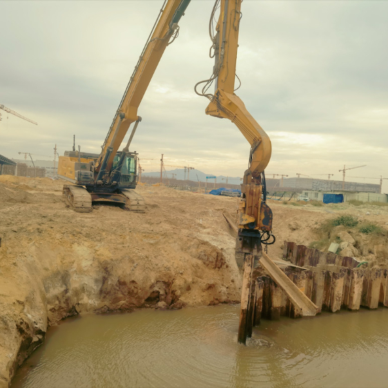 Die PCF-500 Hochleistungs-Spundwandramme stellt den Höhepunkt der Bagger-Anbau-Rammtechnologie dar, die speziell für groß angelegte Spundwandbauprojekte entwickelt wurde. Wie im größten Papierfabriks-Abwasserrohrprojekt Asiens in Zhangzhou gezeigt, wo sie erfolgreich 12 Meter lange Spundwände mit einem XCMG 660DP-Bagger einbrachte, liefert diese Maschine außergewöhnliche Leistung in den anspruchsvollsten Anwendungen. Spundwände mit ihren ineinandergreifenden Kanten bieten entscheidende Erdverankerung und Baugrubenunterstützung sowohl für Bauprojekte als auch für Tiefbauarbeiten, einschließlich Tunnelportalen, Uferbefestigungen, Seemauern und Baugruben.